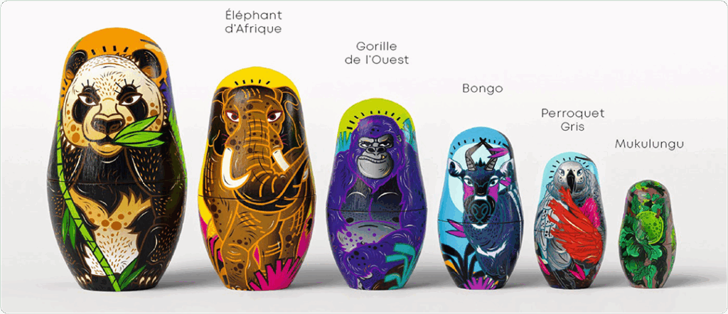 Real nesting dolls were developed with the outer layer representing an umbrella species and inner dolls symbolizing additional species protected. The dolls were sold during the holiday season and portrayed in an immersive virtual gallery on social media and billboards all over France.